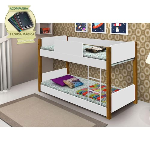 A Beliche Valentina proporciona para o quarto um toque de delicadeza, requinte e conforto. Além de decorar ainda mais o ambiente, ela traz diversão e alta segurança pois é feita em MDF, material resistente e de qualidade.Tipo: BelicheModelo: ValentinaCor: Branco e AmêndoaGarantia: 90 diasProduto DesmontadoMaterial 100% MDFPés em madeira maciçaPintura UV Verniz BrilhoAcompanha lousa mágica (Produto Ecológico, Salva 3 Árvores, para o Desenvolvimento, Botão para Limpar, Bateria Média 2 Anos)Não acompanha colchãoMedidas:Altura: 100cmLargura: 76,5cmComprimento: 160cmAltura entre as barras: 55cmATENÇÃOIMAGENS MERAMENTE ILUSTRATIVAS REALIZADO EDIÇÃO, PODENDO HAVER UMA PEQUENA VARIAÇÃO DE COR DEPENDENDO DE CADA TELA OU MONITOR. Marca: BABY MOBILIA