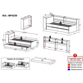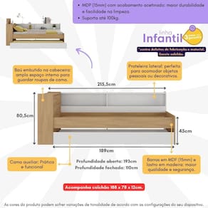 Dimensões do produto montado: Bicama - Altura: 80,5cm | Largura: 215,5cm | Profundidade: 110,5cm (fechada) - 193,5cm (aberta) Colchões - Altura: 12cm | Largura: 188cm | Profundidade: 78cm *Você pode consultar as medidas detalhadas na imagem técnica do produto.