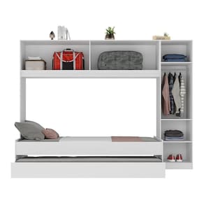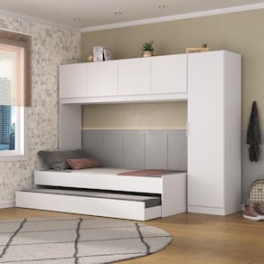 A Bicama de Solteiro com Guarda-Roupas Dublin Multimóveis MP4032 é uma opção com excelente custo-benefício para deixar seu quarto completo. Produzidos em MDP, que garante maior durabilidade e resistência, possuem acabamento acetinado (cerca de 20% de brilho). O guarda-roupas possui 4 portas e 1 porta lateral com puxador em ABS, cabideiro (em madeira) e 3 prateleiras internas, contendo amplo espaço interno organizar roupas e acessórios. Versátil, a porta lateral pode ser montada dos dois lados do guarda-roupas - esquerdo ou direito. A cama de solteiro suporta até 90 kg e a cama auxiliar suporta até 60 kg. NÃO acompanha colchões (tamanho indicado de colchões: Principal: 188 x 88 cm | Auxiliar: 188 x 78 cm).