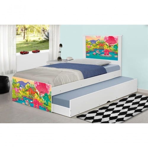 A Bicama Juvenil Barcelona Adesivada Dinossauros Coloridos é belíssima e conta com um design funcional, que ocupa pouco espaço no ambiente. A Coleção Dinossauros Coloridos foi desenvolvida por nossos designers oferecendo um visual exclusivo, descontraído e divertido ao ambiente. A cama auxiliar fica embaixo da principal e basta puxá-la por meio das corrediças para começar a fazer dela. É ideal para quartos pequenos e para caso precise de uma cama extra para receber um amigo, ou divida o dormitório com alguém. Feita em MDF e MDP e seu acabamento é feito com pintura UV brilhante tornando-a um produto resistente e com aspecto de novo por muito mais tempo. É uma excelente escolha para acomodar colchões de solteiro na medida de 188 cm x 88 cm de largura.