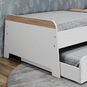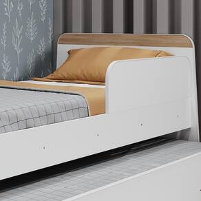 Bicama Infantil com Proteção Lateral Lorenza Movelbras Branco/Aveiro. A bicama solteiro Lorenza, possui um design diferenciado com detalhe amadeirado e acabamento em perfil PVC soft cabeceira e peseira, proporcionando maior conforto ao toque. É uma ótima opção para espaços pequenos, pois possui uma cama auxiliar com 4 rodízios permitindo rapidez e agilidade na movimentação. A proteção lateral que acompanha a bicama traz segurança para as crianças. Ean: 7909903136164