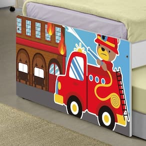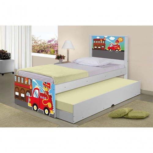 A Bicama Juvenil Barcelona Adesivada Bombeiro é belíssima e conta com um design funcional, que ocupa pouco espaço no ambiente. A Coleção Bombeiro foi desenvolvida por nossos designers oferecendo um visual exclusivo, descontraído e divertido ao ambiente. A cama auxiliar fica embaixo da principal e basta puxá-la por meio das corrediças para começar a fazer dela. É ideal para quartos pequenos e para caso precise de uma cama extra para receber um amigo, ou divida o dormitório com alguém. Feita em MDF e MDP e seu acabamento é feito com pintura UV brilhante tornando-a um produto resistente e com aspecto de novo por muito mais tempo. É uma excelente escolha para acomodar colchões de solteiro na medida de 188 cm x 88 cm de largura.