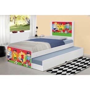 A Bicama Juvenil Barcelona Adesivada Futebol Meninos é belíssima e conta com um design funcional, que ocupa pouco espaço no ambiente. A Coleção Futebol Meninos foi desenvolvida por nossos designers oferecendo um visual exclusivo, descontraído e divertido ao ambiente. A cama auxiliar fica embaixo da principal e basta puxá-la por meio das corrediças para começar a fazer uso dela. É ideal para quartos pequenos e para caso precise de uma cama extra para receber um amigo, ou divida o dormitório com alguém. Feita em MDF e MDP e seu acabamento é feito com pintura UV brilhante tornando-a um produto resistente e com aspecto de por muito mais tempo. É uma excelente escolha para acomodar colchões de solteiro na medida de 188 cm x 88 cm de largura.