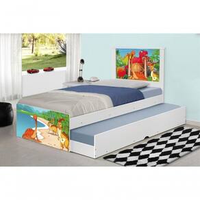 A Bicama Juvenil Barcelona Adesivada Terra dos Dinossauros é belíssima e conta com um design funcional, que ocupa pouco espaço no ambiente. A Coleção Terra dos Dinossauros foi desenvolvida por nossos designers oferecendo um visual exclusivo, descontraído e divertido ao ambiente. A cama auxiliar fica embaixo da principal e basta puxá-la por meio das corrediças para começar a fazer uso dela. É ideal para quartos pequenos e para caso precise de uma cama extra para receber um amigo, ou divida o dormitório com alguém. Feita em MDF e MDP e seu acabamento é feito com pintura UV brilhante tornando-a um produto resistente e com aspecto de por muito mais tempo. É uma excelente escolha para acomodar colchões de solteiro na medida de 188 cm x 88 cm de largura.