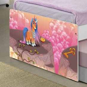 A Bicama Juvenil Barcelona Adesivada Unicórnios Mágicos é belíssima e conta com um design funcional, que ocupa pouco espaço no ambiente. A Coleção Unicórnios Mágicos foi desenvolvida por nossos designers oferecendo um visual exclusivo, descontraído e divertido ao ambiente. A cama auxiliar fica embaixo da principal e basta puxá-la por meio das corrediças para começar a fazer dela. É ideal para quartos pequenos e para caso precise de uma cama extra para receber um amigo, ou divida o dormitório com alguém. Feita em MDF e MDP e seu acabamento é feito com pintura UV brilhante tornando-a um produto resistente e com aspecto de novo por muito mais tempo. É uma excelente escolha para acomodar colchões de solteiro na medida de 188 cm x 88 cm de largura.