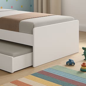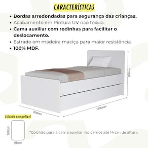 Características da cama: -Auxiliar com rodinhas para facilitar o deslocamento (abre para os dois lados). -Pintua UV Não Tóxica para não prejudicar a saúde das crianças. -100% MDF -Próprio para colchão de solteiro padrão 88x188cm.