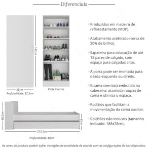 Especificações Técnicas: Bicama - Altura: 80,5cm | Largura: 215,5cm | Profundidade: 88 (fechada) - 171cm (aberta) Sapateira - Altura: 147 cm | Largura: 55 cm | Profundidade: 37,5 cm Material: MDP (12 e 15mm) Tipo de Cama: Bicama Peso Suportado da Cama Principal: 100kg Peso Suportado da Cama Auxiliar: 70kg Inclui Rodízios: Sim Sapateira Inclusa no Kit: Sim Colchões Inclusos: Não (tamanho indicado: 188x78cm)