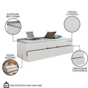A Bicama é feita 100% MDP que oferece resistência, durabilidade e estabilidade. Ela tem um acabamento impecável, graças à pintura UV alto brilho, que protege a superfície do móvel contra riscos, manchas e desgastes, o brilho confere um aspecto de e limpo, além de facilitar a limpeza e a higienização. E ainda conta com uma Cama Auxiliar encaixada embaixo da cama principal, ocupando pouco espaço quando não está em uso. A cama auxiliar tem rodízios que facilitam o seu deslocamento e encaixe. A cama auxiliar é ideal para receber visitas ou amigos do seu filho, assim você pode proporcionar mais conforto, sem precisar de um quarto extra. A Cama De Solteiro tem um design moderno e elegante, que combina com qualquer estilo de decoração, pois tem uma estética leve e minimalista, que não sobrecarrega o ambiente e transmite uma sensação de amplitude e organização.