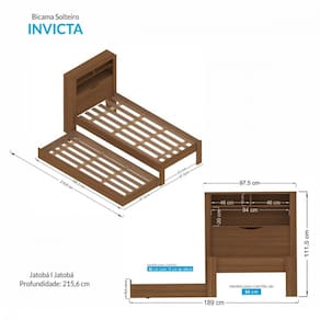 Características: - Estrutura em MDP e MDF 12 e 15 mm - Colchões compatíveis: 88x188 cm (nãi inclusos) - Barras laterais em MDF 18 mm - Estrado em madeira de pinus de alta qualidade - Travessas em madeira de pinus - Ripas MDF 09 mm - Baú na cabeceira com puxador em cava - Prateleira na cabeceira - Acabamento/Pintura: Verniz fosco - Cama Auxiliar possui 4 rodizios - Suporte de peso de cada cama 80 kg - Garantia de 3 meses