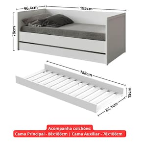 * Estrutura em MDF resistente e de alta qualidade. * Suporta até 100kg na cama principal e 80kg na cama auxiliar. * Acabamento em pintura UV: maior proteção, resistência e durabilidade. * Cama auxiliar com rodízios que facilitam a movimentação. * Design moderno com encosto que traz charme e conforto. * Ideal para otimizar espaço no quarto infantil, juvenil ou de hóspedes. * Colchões inclusos em espuma D23 com tratamento antiácaro, antialérgico e antimofo, oferecendo noites saudáveis e revigorantes.