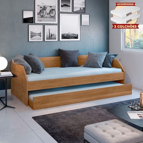 AS IMAGENS SÃO MERAMENTE ILUSTRATIVAS E PODEM SOFRER VARIAÇÕES DE COR E PEQUENOS DETALHES DE ACORDO COM O SEU MONITOR, ILUMINAÇÃO DO AMBIENTE E ATÉ MESMO A SUA PERCEPÇÃO Solteiro Duo com Cama Auxiliar em Mdf Premium Amendoa com 2 ColchÃes