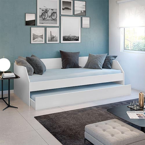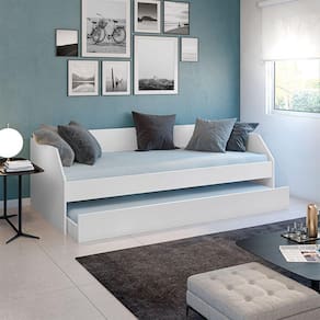 Bicama Solteiro Duo Com Cama Auxiliar Em Mdf Premium Branco - Cor: Branco O Sofá Cama Duo é um produto versátil, que possibilita o uso durante o dia, como sofá, e a noite como cama. Além de possuir um design moderno e neutro que se adapta a qualquer estilo de decoração, levando conforto, praticidade e elegância para a sua casa.CARACTERÍSTICAS:Tipo: Sofá camaModelo: DuoCor: BrancoProduto não acompanha colchãoDIMENSÕES DO PRODUTO:Altura: 66cmLargura: 193cmComprimento cama fechada: 94cmComprimento cama aberta: 185cmInformações adicionais:- Material e espessura estrutura de cada parte do produto: Todo em MDP 15mm, com barra lateral 15mm, com cama auxiliar em MDF 15mm.- Peso máximo suportado cada cama: 100Kg em uso comum.- Tem estrado na cama auxiliar?: tem estrado de madeira, e suporte de travessas anti-ruidos.- Altura do estrado da cama auxiliar em relação ao chão: 6cm.- Tem Rodízios na cama auxiliar?: sim 4 rodízios deslizantes.- Tamanho dos colchões recomendados para as duas camas: sofá até 16 cm altura - Auxiliar até 12 cm.- Altura do assento: 40cm aproximadamente, dependendo da altura do colchão.- Tipo de fixação dos materiais: parafusos Philips.ATENÇÃOAS IMAGENS SÃO MERAMENTE ILUSTRATIVAS E PODEM SOFRER VARIAÇÕES DE COR E PEQUENOS DETALHES DE ACORDO COM O SEU MONITOR, ILUMINAÇÃO DO AMBIENTE E ATÉ MESMO A SUA PERCEPÇÃO VISUAL.Bicama Solteiro Duo com Cama Auxiliar em Mdf Premium Branco Marca: Movelaria Store