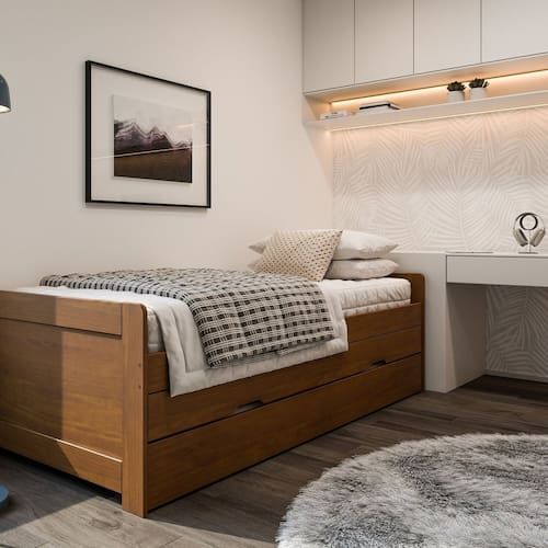 A Bicama Luma é ideal para quem busca otimizar o espaço sem abrir mão do conforto e da organização. Com um design clean e moderno, ela se harmoniza facilmente com qualquer decoração, especialmente em ambientes infantis e juvenis. Conta com uma prática Cama Auxiliar de rodízios, que desliza suavemente para oferecer um leito extra. Perfeita para receber amigos, primos ou para os pais que precisam acompanhar a criança durante a noite.O módulo inferior também integra duas gavetas espaçosas, ideais para guardar roupas de cama, brinquedos, livros ou objetos pessoais, mantendo o quarto sempre arrumado. Transforma o ambiente de dormir em um espaço de convivência e organização de forma rápida e eficiente. A solução perfeita para quartos versáteis! Produto Montado: Sim Acabamento da Gaveta: Pintura Acompanha Cama Auxiliar: Sim Acompanha Colchão: Não Altura do Estrado até o Chão: 41 cm Ambiente Principal: Quarto Cama Auxiliar Acompanha Colchão: Não Cama Auxiliar com Rodízio: Sim Cama Auxiliar Suporta Até (kg): 50 kg codigo_ean: 7900288280800 Complexidade da Montagem: Média: pode ser montado por mais de uma pessoa e/ou necessite de maior conhecimento para montagem Cor: Amendoa Cor do Produto: Amendoa Escala de Brilho: Semi-Brilho Escala de Brilho da Gaveta: Semi-Brilho Extensível: Não Gaveta com Chave: Não Itens Inclusos: 1 Bicama, Kit Ferragem e Manual de Montagem. Linha ou Coleção: Luma Manual de Montagem e Instalação: https://product-hub-prd.madeiramadeira.com.br/765971175/documents/a6689742-0c8f-44ae-8636-dddf437c1319900240miulli190x90montagem.pdf Marca: Inter Link Material da Gaveta: Madeira Maciça Material do Estrado: Pinus Material Principal: Madeira Maciça Necessita Montagem: Sim Origem do Produto: Nacional Permite a Utilização de Cama Auxiliar: Sim Peso: 44,5 kg Peso Máximo por Gaveta: 10 kg Peso Suportado por cada cama: 100 kg Possui Baú: Não Possui Escrivaninha: Não Possui Gavetas: Sim Possui Nichos: Não Possui Pés: Não Possui Portas: Não Possui Prateleiras: Não Possui Rodízio: Sim Quantidade de Gavetas: 02 Gavetas Recomendações de Uso, Manutenção e Limpeza: Não colocar o produto em lugar úmido, não arrastar, limpar somente com pano macio e seco, não expor o produto a incidência de luz solar, não colocar peso superior ao indicado. Rodízio com Trava: Não Sistema de Montagem: Parafusos, Cavilhas Tamanho da Cama: Solteiro Tamanho do Colchão Indicado (L x C): 88x188 Tamanho do Colchão Indicado Cama Auxiliar: 88x184 Tipo de Cama: Bicama Tipo de Colchão: Solteiro Tipo de Corrediça da Gaveta: Madeira Tipo de Estrado: Fixo Tipo de Madeira Maciça: Pinus Tipo de Madeira Maciça da Gaveta: Pinus Tipo de Puxador da Gaveta: Embutido