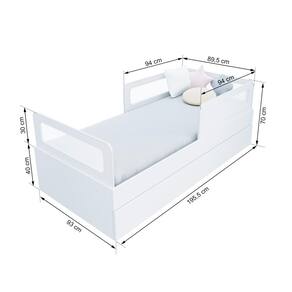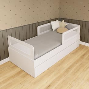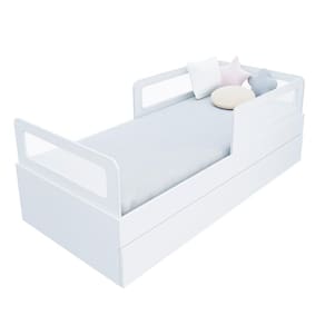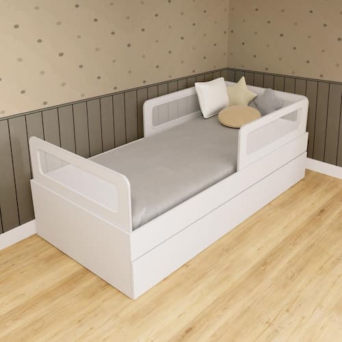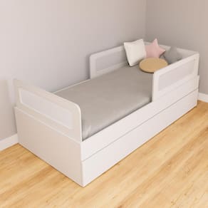 Diferenciais: Auxiliar com 4 rodízios, MDF Melamina 15mm, Estrados em Madeira Maciça, 02 Grades e Cabeceira e Peseira Anatômica com Telinha PVC e Poliéster.