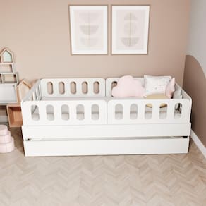 Diferenciais: Auxiliar com 4 rodízios, MDF Melamina 15mm, Estrados em Madeira Maciça, 04 Grades e Cabeceira e Peseira Anatômica.