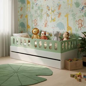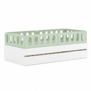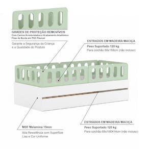 Diferenciais: Auxiliar com 4 rodízios, MDF Melamina 15mm, Estrados em Madeira Maciça, 04 Grades e Cabeceira e Peseira Anatômica.