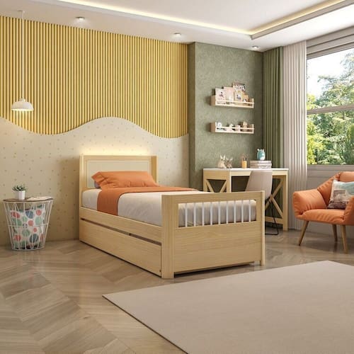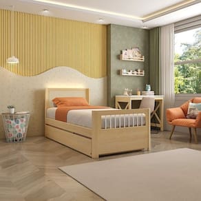 A Bicama Solteiro Juvenil Wave é perfeita para um quarto infantil ou juvenil, oferecendo segurança, conforto e um design contemporâneo com detalhes naturais em rattan (sintético ? pvc). Essa cama conta com iluminação LED embutida, criando um ambiente acolhedor e seguro para o sono e descanso dos pequenos. Além disso, a cama auxiliar é prática e ideal para acomodar visitas ou irmãos. O design funcional e o acabamento em madeira natural fazem deste móvel uma peça sofisticada e funcional para o dia a dia. Acompanha Colchão: Não Altura do Conjunto: 91 cm Ambiente Principal: Quarto Infantil codigo_ean: 7900288013996 Cor: Branco/Natural Cor do Produto: Branco/Natural Informação Complementar: 1x Cama Auxiliar Prime II Natural Largura: 188 cm Altura: 21 cm Peso: 13 kg Profundidade: 85,3 cm Necessita Montagem: Sim 1x Cama Solteiro Wave Juvenil Montessoriana Reversivel em Rattan com Led Branco/Natural Largura: 194,2 cm Altura: 91 cm Peso: 31,5 kg Profundidade: 94,2 cm Necessita Montagem: Sim Largura do Conjunto: 202.2 cm Marca: Casatema Material Principal: Madeira Maciça Permite a Utilização de Cama Auxiliar: Não Possui Portas: Não Possui Rodízio: Sim Suporta Até (kg): 100 kg