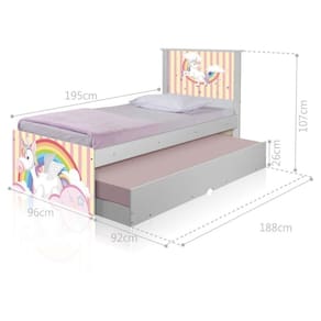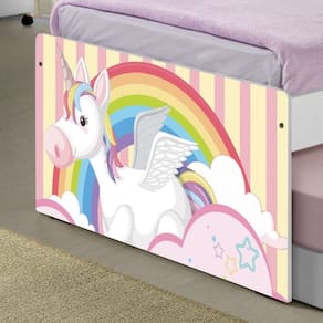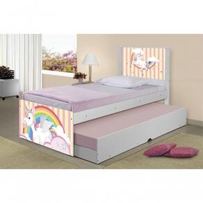 A Bicama Juvenil Barcelona Adesivada Unicórnio Meigo é belíssima e conta com um design funcional, que ocupa pouco espaço no ambiente. A Coleção Unicórnio Meigo foi desenvolvida por nossos designers oferecendo um visual exclusivo, descontraído e divertido ao ambiente. A cama auxiliar fica embaixo da principal e basta puxá-la por meio das corrediças para começar a fazer dela. É ideal para quartos pequenos e para caso precise de uma cama extra para receber um amigo, ou divida o dormitório com alguém. Feita em MDF e MDP e seu acabamento é feito com pintura UV brilhante tornando-a um produto resistente e com aspecto de novo por muito mais tempo. É uma excelente escolha para acomodar colchões de solteiro na medida de 188 cm x 88 cm de largura.