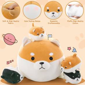 Bicho de pelúcia Shiba Inu com 4 bebês, - 🐕?Conjunto de pelúcia 5 em 1 para cães e compartilhe jogos com amigos?Este conjunto de pelúcia de 5 peças consiste em um grande Shiba Inu de pelúcia e 4 bebês Shiba Inu. O conjunto de brinquedos de pelúcia para cães é cheio de diversão e é mais adequado para as crianças compartilharem e brincarem com os amigos. - 💖?Seguro e durável, de qualidade e mais seguro para crianças?Este conjunto de pelúcia para cães é feito de tecido de alta qualidade, finamente feito e muito durável. O brinquedo de pelúcia para cães passou pela certificação CPSIA e está em conformidade com os padrões do CPSC e é preenchido com 100% algodão PP, macio como uma nuvem. - 💖?Função fácil de limpar e armazenar?A pelúcia Shiba Inu é feita de tecido de pelúcia curto e é fácil de limpar. Além de manter o quarto arrumado. O design com zíper na barriga permite o armazenamento rápido dos brinquedos após o jogo e mantém o quarto arrumado. - 💖?Diferentes cenários de uso e alívio do desconforto?Adequado para sala de estar, quarto, jardim de infância, sala de jogos, almofada de escritório, travesseiro de soneca e viagens de carro. Quando você se sentir cansado, deite-se sobre ele e descanse para aliviar o desconforto. Este é um travesseiro para cães que liberará a felicidade. - 🎁?Seleção de presentes de alta qualidade e amigos calorosos para crianças?Dê para sua família, amigos ou filhos em aniversários especiais, como Natal, aniversários e Dia das Crianças. Este é definitivamente um ótimo presente. Use este brinquedo de pelúcia para transmitir seu amor, e ele sempre estará com a pessoa que você ama.