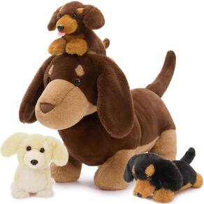 Bicho de pelúcia para cães Dachshund com 3 bebês - Pelúcia de cachorro Dachshund de pelúcia 4 em 1: o dachshund da mamãe grande vem com 3 bebês adoráveis. Abra o zíper, você encontrará a surpresa. Deixe as crianças brincarem com a família de cães dachshund. - Design realista: nossos brinquedos de dachshund de pelúcia são realistas em termos de cor, estatura corporal e rosto. Ele cativa a imaginação do seu filho, proporcionando horas de brincadeiras interativas em ambientes internos e externos, despertando a paixão do seu filho por explorar o mundo do dachshund. - Tamanho adequado: o bicho de pelúcia grande mede 45 cm, macio e aconchegante, ótimo tamanho para abraços. E os lindos bebês dachshund são adequados para mãos pequenas. É uma companhia perfeita para as crianças na hora de dormir, relaxar, brincar e estudar. - Multifuncional: o cão salsicha de pelúcia pode ser utilizado como um brinquedo educativo crescendo com seu filho. Como é muito macio, pode ser seu travesseiro quando você se sentir cansado. Também é uma escolha maravilhosa para decorar a festa ou sala com tema animal do seu filho, proporcionando mais diversão para a festa. - Presente adorável: o brinquedo de dachshund macio é um presente adorável para os amantes de cães em qualquer ocasião, como Dia dos Namorados, aniversário, dia de Natal, Halloween, Dia de Ação de Graças, chá de bebê, Páscoa. É uma escolha fantástica para espalhar felicidade e criar memórias queridas.