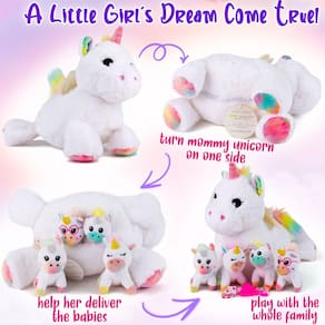- Recomendação de idade: Este adorável unicórnio da mamãe arco-íris com bebês é adequado para crianças a partir de 3 anos.
