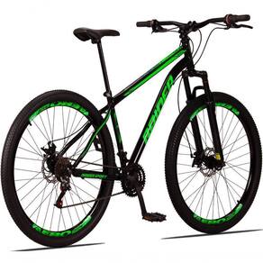 Aro: 29 | Marchas: 21 | Modalidade: Passeio | Suspensão: Dianteira | Material do Quadro: Quadro em Aço | Modelo e Composição do Garfo: Suspensão Preto 29 | Marca e Modelo do Sistema de Câmbio: Câmbio Dianteiro imp. 3v imp / Câmbio Traseiro imp. 7v imp / Trocador de Marchas Grip Shift - 21v - imp. | Marca e Composição do Pedivela: Pedivela 3 Coroas em Aço | Modelo e Composição do Freio: Freio a Disco 160mm Preto - MECÂNICO | Material da Roda: Aros Aero 36 Furos Folha Dupla Alumínio | Pneus: Pneu 29 (Imp.) | Marca e Composição dos Cubos: Cubos Rosca 36f em aço | Modelo e Composição do Guidão: Guidão Reto em Alumínio | Marca e Composição do Selim: Selim Sport | Material do Canote: Aço 22.2 | Importante: Bicicleta para passeios e trilhas leves, não indicada para manobras radicais e trilhas pesadas / Consulte o tamanho de quadro adequado à sua altura antes de realizar a compra. | Montagem do Equipamento: A montagem é de responsabilidade do cliente, sugerimos que seja efetuada por uma oficina especializada. | Garantia do Fabricante: 90 dias. A garantia será validada para as bicicletas montadas e revisadas por uma oficina especializada e é referente apenas ao primeiro proprietário | Informação Relevante: Pode haver alguma diferença de tonalidade entre a imagem e o produto real, por conta do tratamento de imagens e a calibração de cores do monitor Cor: Preto+verde