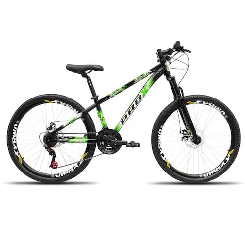 Componentes da Bike Freeride Pro-X Mandrake Hiten 2024   A bicicleta montada com o quadro PRO-X Freeride Mandrake Hiten foi projetada para encarar trilhas e terrenos acidentados, oferecendo durabilidade, controle e potência. Seus componentes foram cuidadosamente selecionados para proporcionar uma experiência de pilotagem de alta performance no freeride. Veja abaixo os detalhes:   Suspensão e Estrutura   Garfo: Suspensão com 80mm de curso. Quadro: PRO-X Freeride Mandrake Hiten. Aros: Vmaxx LT para freios a disco, com folha dupla para maior resistência. Raios: Zincados. Pneus: Aro 26 com cravos, oferecendo tração superior. Câmaras de Ar: aro 26 Bico Grosso.   Componentes de Controle   Jogo de Direção: Over Head Set. Suporte do Guidão: 31.8mm. Guidão: 31.8mm. Canote do Selim: Ajustável para conforto personalizado. Pedais: Inclusos. Arruela Calço: Ahead Set com 1cm guidão. Manoplas: MTB. Abraçadeira do Selim com Blocagem: Para ajustes rápidos e práticos. Selim: MTB. Sistema de Freios   Disco de Freio: 160mm para uma frenagem eficiente e segura. Freio a Disco Mecânico: Com pinças e pastilhas, oferecendo potência de frenagem confiável.   Relação (Transmissão da Bike)   Roda Livre: Indexada 7 velocidades. Pedivela: Aço encapado. Trocador: 21 velocidades (3x7). Câmbio Dianteiro: Indexado, com 3 velocidades. Câmbio Traseiro: Indexado, com 7 velocidades. Cubos: De rosca. Corrente: Indexada 7V. Jogo de Centro: Selado e rolamentado.
