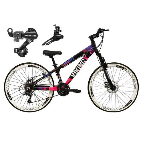 Bike aro 26, VIKINGX TUFF, nova na caixa a pronta entrega, produto com ótima qualidade e acabamento, possui 21 marchas com sistema de alavancas rapid fire que a cada clique uma marcha é trocada, sistema de freio a disco mecânico, pneus slick 1.5 com faixa branca. Bicicleta pré montada, vai precisar apenas fixar a roda dianteira, guidão, selim e pedais. Segue abaixo características da bike: Quadro 26 VikingX Tuff em Alumínio / Garfo aço preto 60mm suspensão / Suporte do guidão em alumínio preto / Guidão 31.8mm em alumínio preto / Canote do selim 27.2 em alumínio preto Sem carrinho / Selim Pro-X Freeride ou Yamada Mtb (dependerá da disponibilidade no estoque) / Abraçadeira do Selim alumínio Preto / Aros Vmaxx Super reforçados / Raios Finos / Cubos Pretos / Pneus 26x1.5 Slick com faixa branca / Movimento central selado rolamentado / Freios a disco Mecânicos com discos inox 160mm / Alavancas Semi-automáticas Rapid Fire / Câmbio Traseiro Shimano TZ / Câmbio Dianteiro Shimano TZ / Corrente Index / Pedivela Aço Revestido / Pedal Plataforma Nylon preto / Roda Livre 7v index dourada