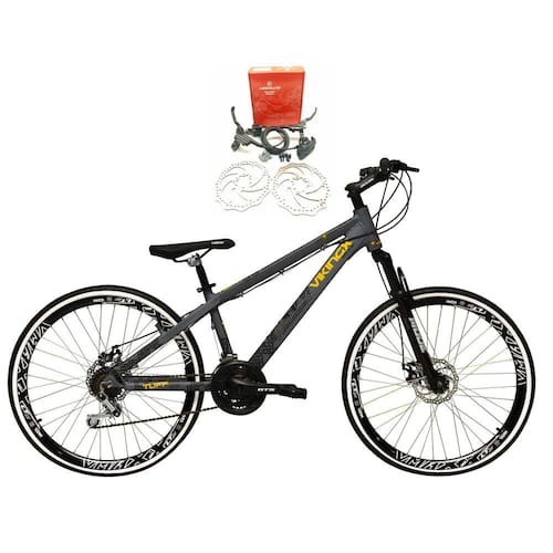 Bike aro 26, vikingx tuff, nova na caixa a pronta entrega, produto com ótima qualidade e acabamento, possui 21 marchas com sistema de alavancas rapid fire que a cada clique uma marcha é trocada, sistema de freio a disco hidráulico, pneus slick 1.5 com faixa branca. Bicicleta pré montada, vai precisar apenas fixar a roda dianteira, guidão, selim e pedais. Segue abaixo características da bike:Quadro 26 VikingX Tuff em Alumínio Garfo aço preto 60mm suspensãoSuporte do guidão em alumínio pretoGuidão 31.8mm em alumínio pretoCanote do selim 27.2 em alumínio preto Sem carrinhoSelim Pro-X Freeride ou Yamada Mtb (dependerá da disponibilidade no estoque)Abraçadeira do Selim alumínio PretoAros Vmaxx Super reforçadosRaios FinosCubos PretosPneus 26x1.5 Slick com faixa brancaMovimento central selado rolamentadoFreios a disco Hidráulico com discos inox 160mmAlavancas Semi-automáticas Rapid FireCâmbio Traseiro ImportadoCâmbio Dianteiro ImportadoCorrente IndexPedivela Aço RevestidoPedal Plataforma Nylon pretoRoda Livre 7v index dourada