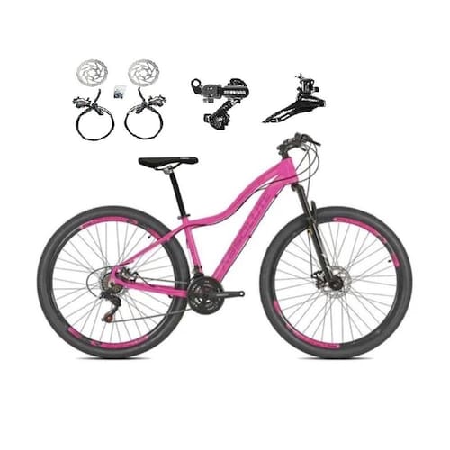 Bike aro 29 Absolute Hera Feminina em alumínio, nova na caixa a pronta entrega, produto com ótima qualidade e acabamento, possui 24 marchas com câmbio dianteiro e traseiro Shimano e sistema de alavancas rapid fire que a cada clique uma marcha é trocada, garfo com suspensão, sistema de freio a disco hidráulico(óleo). Quadro com tubo rebaixado para facilitar subir e descer da bike. Bicicleta pré montada, vai precisar apenas fixar a roda dianteira, guidão, selim e pedais.Segue abaixo características da bike:Quadro 29 Absolute Hera Feminina em alumínio 6061Garfo 29 suspensão curso 60mmSuporte do guidão em alumínio pretoGuidão 31.8mm em alumínio pretoCanote do selim 27.2 sem carrinhoSelim Sport pretoAbraçadeira do Selim alumínio PretoAros Aero Parede dupla reforçadoRaios PretosCubos Pretos açoPneus 29 cravudoMovimento central selado rolamentadoFreios a disco Hidráulicos(a óleo) com discos inox 160mmAlavancas Semi-automáticas Rapid FireCâmbio Traseiro shimano tzCâmbio Dianteiro shimano tzCorrente IndexPedivela Aço RevestidoPedal Plataforma Nylon pretoRoda Livre 8v index dourada (rosca)