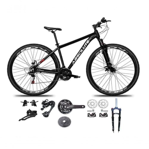 Bike aro 29, com quadro Absolute Nero 5, nova na caixa a , produto com ótima qualidade e acabamento, possui 18 marchas com sistema de coroa dupla e 9 catracas (conhecido como 2x9), alavancas rapid fire que a cada clique uma marcha é trocada, câmbio dianteiro e traseiro Sunrun , Catraca do tipo k7 de encaixe, garfo com suspensão e sistema de trava para melhor performance, sistema de freio a disco mecânico, pneus com cravo baixo para uso em terra e asfalto. Bicicleta pré montada, vai precisar apenas fixar a roda dianteira, guidão, selim e pedais.Segue abaixo características da bike:Quadro 29 Absolute Nero 5 em Alumínio, Garfo 29 100mm suspensão com Trava no Ombro, Suporte do guidão em alumínio preto, Guidão 31.8mm em alumínio preto, Canote do selim 27.2 em alumínio preto Com carrinho, Selim Sport preto, Abraçadeira do Selim alumínio Preto, Aros Aero Parede dupla reforçado, Raios Pretos, Cubos Pretos Alumínio para K7 com blocagens, Pneus 29 Com Cravo, Movimento central selado rolamentado, Freios a disco Mecânicos com discos 160mm, Alavancas Semi-automáticas Rapid Fire Gta Sunrun 2x9, Câmbio Traseiro Sunrun Cage Longo 43d, Câmbio Dianteiro Sunrun 2v Duplo, Corrente Index PACO/DTO 9v, Pedivela Alumínio Duplo Gta 24/38D 175mm, Pedal Plataforma Nylon preto, Cassete Sunrun 9v 11/36d, Peso de Referência 15,5kg ;