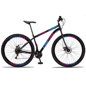 Suspensão: Rigida | Modalidade: Mountain Bike | Aro: 29 | Marchas: 21 Cor: Preto/Azul e Rosa