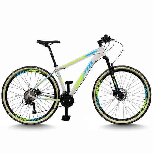 Suspensão: Dianteira | Modalidade: Mountain Bike | Aro: 29 | Marchas: 24 Cor: Branco/Verde e Azul