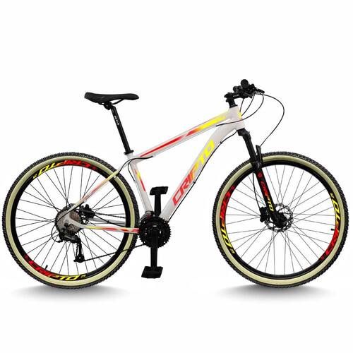 Bicicleta Aro 29 Cripto 24 Marchas Freios Disco e Suspensão Pneu Bege - 19"-Branco/Amarelo e Vermelho