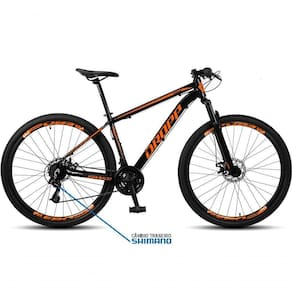 Aro: 29 | Marchas: 24 | Modalidade: Passeio | Suspensão: Dianteira | Material do Quadro: Alumínio | Modelo e Composição do Garfo: Garfo / Suspensão Aro 29 PRETO 100mm (Imp.) | Marca e Modelo do Sistema de Câmbio: Câmbio Dianteiro (IMP.) / Câmbio Traseiro Shimano / Trocador de Marchas Engate Rápido - 24V (IMP.) | Marca e Composição do Pedivela: Pedivela Aço 42/34/24 Dentes (Imp.) | Modelo e Composição do Freio: Freio a Disco 160mm Preto - MECÂNICO (Imp.) | Material da Roda: Aros Aero 36 Furos Folha Dupla Alumínio | Pneus: Pneu (Imp.) 29x2.10 | Marca e Composição dos Cubos: Cubos p/ Disco 36f rosca Preto com blocagens (Imp.) | Modelo e Composição do Guidão: Guidão 680mm Aço | Marca e Composição do Selim: Selim Sport | Material do Canote: 27.2 | Importante: Bicicleta para passeios e trilhas leves, não indicada para manobras radicais e trilhas pesadas Cor: Preto+laranja