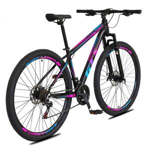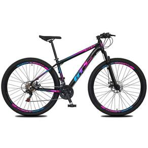 Aro: 29 | Marchas: 24 | Modalidade: Passeio | Suspensão: Dianteira | Material do Quadro: Quadro GT Sprint MX7 Aro 29 em ALUMÍNIO 6061 | Modelo e Composição do Garfo: Garfo / Suspensão Aro 29 PRETO | Marca e Modelo do Sistema de Câmbio: Câmbio Dianteiro Imp. 3v index / Câmbio Traseiro imp. 8v index / Trocador de Marchas Engate Rápido Rapidfire- 24v | Marca e Composição do Pedivela: Pedivela em Aço 24/34/42 | Modelo e Composição do Freio: Freio a Disco 160mm Preto - MECÂNICO | Material da Roda: Aros Aero 36 Furos Folha Dupla Alumínio | Pneus: Pneu 29 (Imp.) | Marca e Composição dos Cubos: Cubos em Aço p/ Disco 36f Preto com Blocagens | Modelo e Composição do Guidão: Guidão Mega Over Reto Expandido em Alumínio | Marca e Composição do Selim: Selim Sport - com carrinho | Material do Canote 27.2: Alumínio | Importante: Bicicleta para passeios e trilhas leves, não indicada para manobras radicais e trilhas pesadas / Consulte o tamanho de quadro adequado à sua altura antes de realizar a compra. | Montagem do Equipamento: A montagem é de responsabilidade do cliente, sugerimos que seja efetuada por uma oficina especializada. | Garantia do Fabricante: 90 dias. A garantia será validada para as bicicletas montadas e revisadas por uma oficina especializada e é referente apenas ao primeiro proprietário | Informação Relevante: Pode haver alguma diferença de tonalidade entre a imagem e o produto real; Algumas peças podem chegar diferente da imagem dependendo do lote do produto, sempre mantendo o padrão de qualidade; Cor: Azul+Rosa