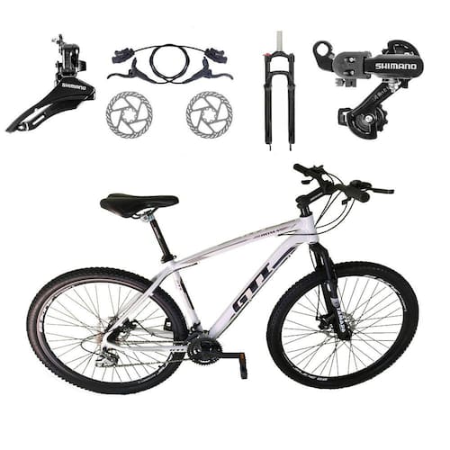 Bike aro 29, com quadro GTI ROMA, nova na caixa a pronta entrega, produto com ótima qualidade e acabamento, possui 24 marchas com sistema de alavancas rapid fire que a cada clique uma marcha é trocada, câmbio dianteiro e traseiro SHIMANO, Catraca do tipo k7 de encaixe, garfo com suspensão e sistema de trava para melhor performance, sistema de freio a disco hidráulico, pneus com cravo baixo para uso em terra e asfalto. Bicicleta pré montada, vai precisar apenas fixar a roda dianteira, guidão, selim e pedais. Segue abaixo características da bike: Quadro 29 GTI ROMA em Alumínio / Garfo 29 suspensão com Trava no Ombro / Suporte do guidão em alumínio preto / Guidão 31.8mm em alumínio preto / Canote do selim 27.2 em alumínio preto Com carrinho / Selim Sport preto / Abraçadeira do Selim alumínio Preto / Aros Aero Parede dupla reforçado / Raios Pretos / Cubos Pretos Alumínio para K7 com blocagens / Pneus 29 Com Cravo / Movimento central selado rolamentado / Freios a disco Hidráulicos com discos inox 160mm / Alavancas Semi-automáticas Rapid Fire Sunrun gta / Câmbio Traseiro SHIMANO TZ PRETO / Câmbio Dianteiro SHIMANO TZ PRETO / Corrente IndexPedivela Alumínio Triplo / Pedal Plataforma Nylon preto / Cassete K7 8v gta preto ou prata(ENCAXE)