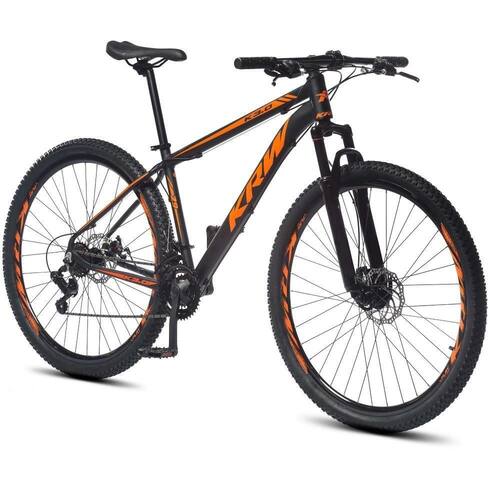 Modalidade: Mountain Bike | Material do quadro: Alumínio | Marchas: 24 | Aro: 29 | Suspensão: Dianteira Cor: Preto/Laranja Fosco