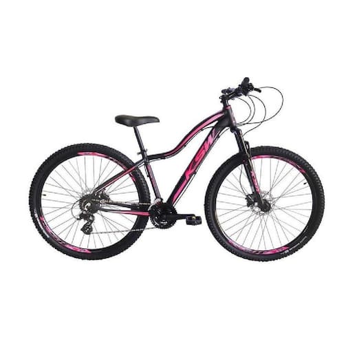 Bike aro 29, com quadro KSW MWZA feminino, nova na caixa a pronta entrega, produto com ótima qualidade e acabamento, possui 24 marchas com sistema de alavancas rapid fire que a cada clique uma marcha é trocada, garfo com suspensão, sistema de freio a disco mecânico. Possui quadro com design rebaixado para facilitar subir e descer da bike. Bicicleta pré montada, vai precisar apenas fixar a roda dianteira, guidão, selim e pedais.Segue abaixo características da bike: