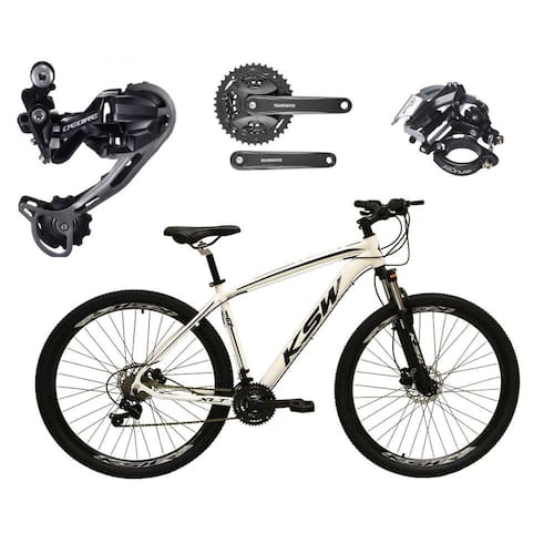 Bike aro 29, com quadro KSW XLT, nova na caixa a pronta entrega, produto com ótima qualidade e acabamento, possui 27 marchas com sistema de alavancas rapid fire que a cada clique uma marcha é trocada, câmbio dianteiro SHIMANO ALTUS e traseiro SHIMANO DEORE M592, garfo com suspensão e sistema de trava para melhor performance, sistema de freio a disco hidráulico, pneus com cravo baixo para uso em terra e asfalto. Bicicleta pré montada, vai precisar apenas fixar a roda dianteira, guidão, selim e pedais. Segue abaixo características da bike: Quadro 29 KSW XLT em Alumínio / Garfo 29 suspensão com Trava no Ombro e regulagem / Suporte do guidão em alumínio preto / Guidão 31.8mm em alumínio preto / Canote do selim 27.2 em alumínio preto Com carrinho / Selim Sport Preto / Abraçadeira do Selim alumínio Preto / Aros Aero Parede dupla reforçado / Raios Pretos / Cubos em Alumínio Pretos com blocagens / Pneus 29 com cravo / Movimento central selado rolamentado / Freios a disco Hidráulicos com discos inox 160mm / Alavancas Semi-automáticas Rapid Fire GTA/SUNRUN / Câmbio Traseiro SHIMANO DEORE M592 27V / Câmbio Dianteiro SHIMANO ALTUS 9v / Corrente Index DTO/PACO / Pedivela SHIMANO Mt101 / Pedal Plataforma Nylon preto / Cassete k7 GTA Sunrun 11/32 cromada