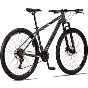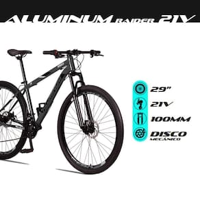A Bicicleta Aluminum Aro 29 Quadro Alumínio 21v Freio a Disco Mecânico é a opção certa para você que pretende adotar um estilo de vida mais saudável. Seja para passeios urbanos, trilhas leves, ou até como seu principal meio de , a bicicleta pode trazer inúmeros benefícios para a sua saúde, além de uma qualidade de vida garantida. A Mountain Bike Raider Aluminum é produzida em quadro ergonômico de alumínio e possui e tamanhos para você escolher. Além disso este equipamento oferece um desempenho incrível em área urbana e íngreme pois foi desenvolvida com componentes super importantes para uma boa performance, possui suspensão dianteira e também é capaz de combinar 21 velocidades com trocador Revoshift que oferece ótimo desempenho em terrenos elevados. Já o freio a disco mecânico proporciona muito mais e tranquilidade nas frenagens. Invista em sua saúde mental e corporal, afinal pedalar é vida! Compre já!
