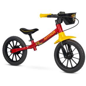 A bicicleta Balance Nathor conta com limitador de giro do guidão (garantindo mais segurança), pneus em E.V.A. (mais leves e antiderrapantes), freio traseiro a tambor e regulagem de altura do selim de PU.