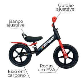 Destaques Exclusivos: - Estrutura Resistente: Metal com plástico de alta durabilidade - Pneus em EVA: Antifuros e macios para diversos terrenos - Eixo em Carbono: Leve e resistente para melhor desempenho - Ajustes Personalizados: - Guidão ajustável em altura - Assento regulável para acompanhar o crescimento - Peso Máximo: Suporta até 21 kg