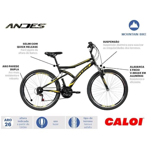 A Caloi Andes, está com um grafismo mais moderno! Bike ideal para passeio em parques, ciclovias e terrenos levemente acidentados. A Caloi Andes além de freio V-Brake em alumínio e suspensão dianteira, agora possui aro com parede dupla!