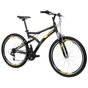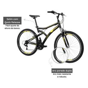 Características Técnicas: Peso máximo suportado: 100 kg Altura sugerida: 1,60 m a 1,80 m Quadro de aço aro 26 com suporte para freios v-brake Aros Vzan escape 26 - alumínio - parede dupla Raios: zincado Pedal plástico Movimento central: neco, B887W Cassete: roda livre 7 velocidades - 14-28D Câmbio dianteiro: Caloi indexado - 3V Guidão MTB aço, 615 x 20 x 25.4 mm Manoplas: plástico - 90 mm Freios V-brake de alumínio Selim: royal ciclo ou DDK Posição do ciclista: confortável ereta Garfo: suspensão Caloi com 30 mm de curso Cubos: aço Pneu MTB - 26x1.95 Pedivela: aço com chain guard 170 mm 42/34/24 Corrente: HV 500 Câmbio traseiro: Caloi indexado 7v Passadores grip - 3x7v Suporte de guidão: aço 100 mm +55 Movimento de direção: oversize com rosca Manete de freios: alumínio Canote do selim: aço 27.2x300 mm - ajuste com quick-release