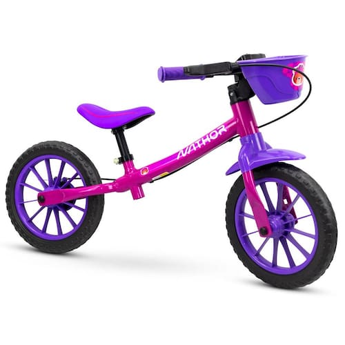 A bicicleta Balance Nathor conta com limitador de giro do guidão (garantindo mais segurança), pneus em E.V.A. (mais leves e antiderrapantes), freio traseiro a tambor e regulagem de altura do selim de PU.