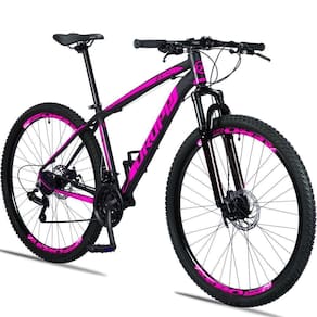 Aro: 29 | Marchas: 21 | Modalidade: Passeio | Suspensão: Dianteira | Material do Quadro: Alumínio | Modelo e Composição do Garfo: Garfo / Suspensão Aro 29 PRETO 80MM | Marca e Modelo do Sistema de Câmbio: Câmbio Dianteiro Shimano TZ 30 / Câmbio Traseiro Shimano TZ 31 / Trocador de Marchas Ez-Fire Engate Rápido - 21V Index | Marca e Composição do Pedivela: Pedivela Reduzido em Alumínio | Modelo e Composição do Freio: Freio a Disco 160mm Preto - MECÂNICO | Material da Roda: Aros Aero 36 Furos Folha Dupla Alumínio | Pneus: Pneu (Imp.) 29x2.10 Cravo Baixo | Marca e Composição dos Cubos: Cubos p/ Disco 36f Preto com Blocagens | Modelo e Composição do Guidão: Guidão Mega Over Reto Expandido em Alumínio | Marca e Composição do Selim: Selim Sport | Material do Canote: Alumínio | Importante: Bicicleta para passeios e trilhas leves, não indicada para manobras radicais e trilhas pesadas Cor: Preto+rosa