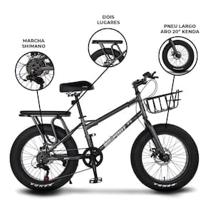 CONFORTO E SEGURANÇA: Ela é uma bike versátil e resistente que enfrenta qualquer tipo de terreno, desde areia até neve, com estabilidade e aderência graças ao seu pneu largo aro 20”. O sistema de amortecimento em uma bicicleta elétrica é projetado para absorver choques e vibrações, proporcionando uma condução mais confortável e estável. E para garantir um desempenho superior na pedalada e uma frenagem precisa em qualquer situação, a Bigfoot T1 tem 7 marchas Shimano e freios a disco nas rodas dianteira e traseira, além de cortar o funcionamento do motor no acionamento do freio. Possui capacidade para 2 lugares e também traz praticidade e conforto com a cesta dianteira e o banco traseiro, perfeitos para levar alguém especial ou seus pertences com segurança. Seus espelhos retrovisores fornecem maior segurança.