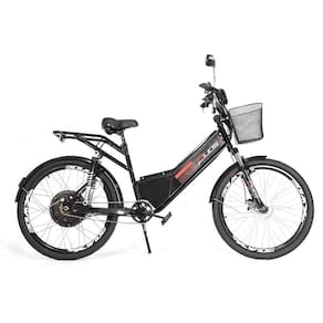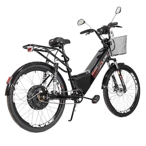 Bicicleta Elétrica - Confort Full - 800w Lithium - Preta - Duos Bikes: a Bicicleta Duos Confort Full Elétrica tem potente motor de 800w, capaz de atender diversas necessidades como: trabalho, transporte ou até mesmo diversão com a família. A Bicicleta Elétrica Confort Full Duos Bikes proporciona segurança, economia, conforto e muita praticidade. Produzida com matéria prima de alta qualidade, que garante resistência e muita durabilidade, mesmo em condições extremas! Você pode recarregar sua bicicleta elétrica em qualquer tomada. Detalhes desse modelo: - Com manete de freio- Botão de velocidade e botão de buzina- Compartimento de bateria e de modulo seguros- Selim- Bagageiro- Sinaleira a pilha- Paralamas dianteiro e traseiro- Refletor - Motor de 800w- Amortecedor dianteiro e traseiro- Sensor de pedal assistido- Tripé lateral - Freio a disco- Espelhinhos retrovisores- CestaInformações:- Produto: Bicicleta Duos Confort Full 48v 13ah- Marca: Duos Bikes- Coleção: Duos Confort Full- Tipo: Bicicleta Elétrica- Categoria: E-bikes e MUV- Dimensões aprox. (C x A x L): 188 cm x 115 cm x 60 cm - Painel de Exibição: com indicador de nível de energia, velocímetro, painel de tensão de bateria e parada (P)- Segurança: Alarme sonoro com trava da roda traseira (Sistema antifurto inteligente)- Rodas / Pneus: Aro 26 - Alumínio Duplo- Altura Indicada (Min-Max): 1.50m a 2.10m- Autonomia Média: 35 a 50km por carga (A autonomia depende do peso do condutor, tipo de bateria, inclinação do terreno, auxílio dos pedais, velocidade média, calibragem dos pneus, etc.)- 03 níveis de velocidade: Eco / Normal / Power - Velocidade máxima: limitada a 32km/h (De acordo com a Resolução 996 art. 2 II Contran)- Peso máximo suportado: capacidade de carga é até 120Kg (para as especificações foi considerado a carga de 90Kg, caso o condutor/passageiro somados ultrapasse esse peso só alterará na autonomia descrita)- Farol: com LED- Pedais: Pedal assistido (pedal system)- Conteúdo:- 01 Bicicleta Elétrica- 02 Chaves de ignição- 02 Controles do alarme- 01 Carregador de bateria inteligente bivolt 110/220- 01 Bateria 48v 13ah (já instalada)- Tempo de carregamento: entre 06 a 08 horas (nunca deixe carregando mais que 08 horas)- Recomendação: acima de 18 anos de idadeEspecificações:- Referência: FULLLTPT- Código de Barras: 7906234243523- Embalagem (C x A x L): 180 x 88 x 32 cm- Embalagem (Peso): 50 kg- Motor: 800w de potência - Bateria: lítio 48V/13ah- Freio: a disco - Material / Composição:- Manete em Alumínio - Aro 26: Alumínio- Guidão: Aço Reforçado - Pedal: Plataforma em alumínio tipo sueco- Quadro: Aço RígidoObservações:- A bicicleta é enviada pré-montada: a bicicleta segue revisada, mas por motivo de acomodação na embalagem para transporte ela não vai completamente montada.- A instalação e revisão final é de responsabilidade do cliente. Sugerindo que seja efetuada por uma oficina especializada- O tempo de carregamento é entre 06 a 08 horas (nunca deixe carregando mais do que 08 horas)- As baterias devem ser carregadas a cada 15 dias mesmo que não sejam utilizadasAviso:- As imagens são meramente ilustrativas- Os pesos, tamanhos, pesos e medidas são aproximados- As cores e estampas dos produtos podem ter variações- As informações são de responsabilidade do fabricante ou fornecedor