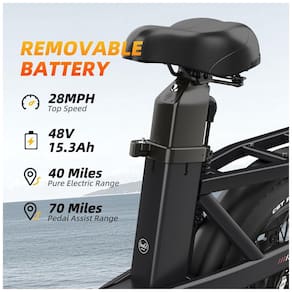 Compatível com smartphones iOS e Android via Bluetooth, a bicicleta permite que você conecte seu aplicativo para verificar o status da bateria, quilometragem e realizar diagnósticos simples. Você também pode controlar remotamente o farol em ambientes escuros. A bateria removível de alta capacidade de 48V 15,3Ah oferece até 75 milhas (120 km) de autonomia por carga, proporcionando liberdade para explorar mais e enfrentar viagens mais longas sem preocupações com a duração da bateria.